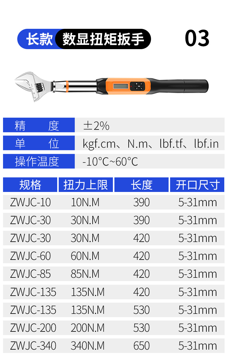可换头数显扭力扳手有别于一般的扭力扳手,其自带的棘轮头可更换为开口头、梅花头、活动开口头等插件,拥有强大的操作功能,包含扭力设定;单位设定;模式设定;数值储存;数值清除;数值输出以及用户校正功能。易于操作,通过安装数字显示屏降低了对操作人员的要求。适用于汽车行业、机械行业等的螺栓紧固及控制。